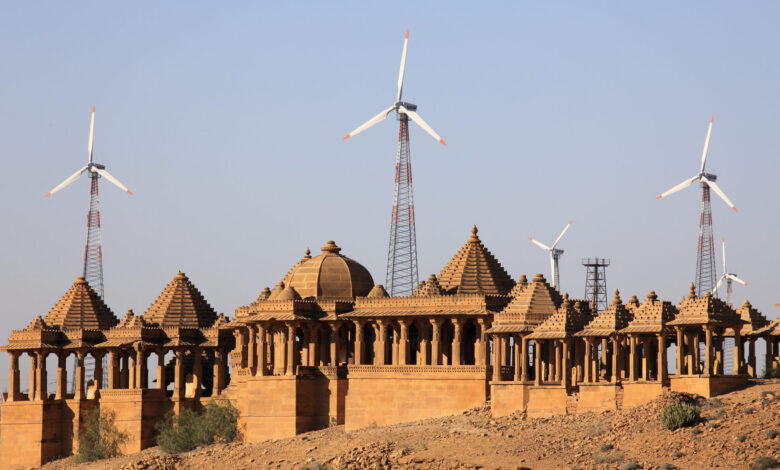 Wind turbines behind Bada Bagh, Jaisalmer, Rajasthan, India. Photo Credit: Tibor Bognar/Getty Images