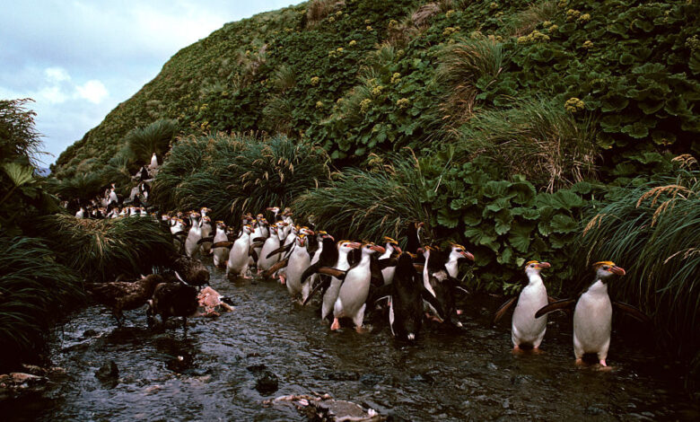Northern rock hopper penguins, Eudyptes moseleyi, colony, Almost the entire population of the species live on Tristan da Cunha and Gough Island, Gough Island, South Atlantic Ocean. Photo Credit: Auscape via Getty Images