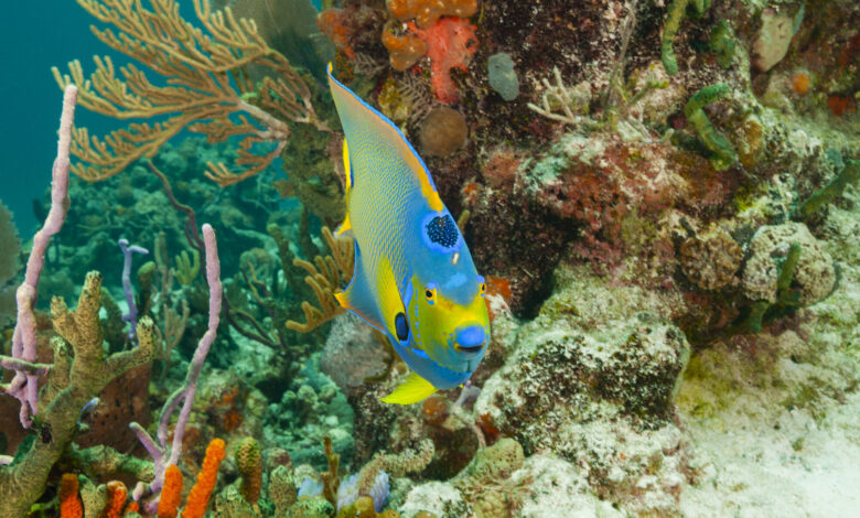 Queen angelfish (Holacanthus ciliaris) in reef system, Bahamas. Photo Credit: Michele Westmorland/Getty Images