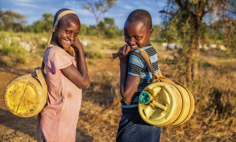 African little girls from Masai tribe carrying water to their village near Mount Kilimanjaro, Kenya, Africa. Photo Credit: hadynyah via Getty Images