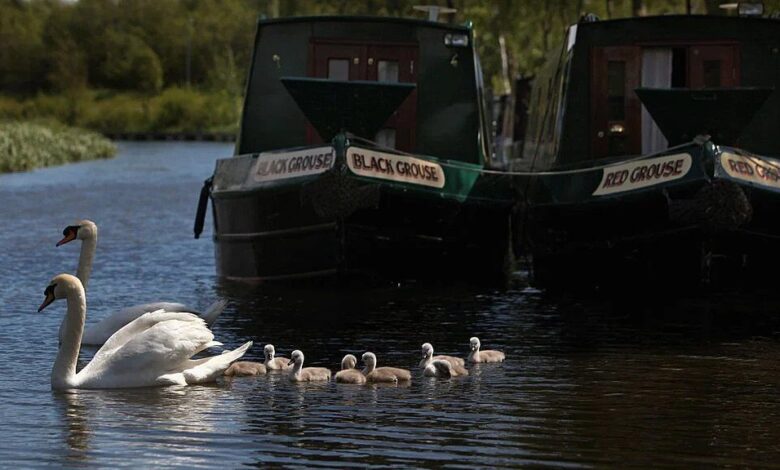 A family of swans swims on the Forth and Clyde in Falkirk in Scotland. Photo Credit: Jeff J Mitchell/Getty Images