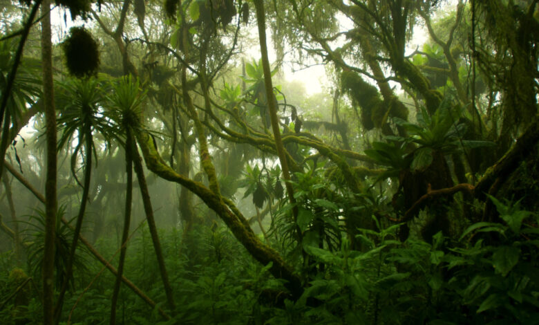Evergreen cloud forest on the slopes of Mt. Rwenzori. This type of forests is created by a wet and moisture climate and is characterized by a high incidence of low-level cloud cover. The forest is that dense that there is rarely light coming until to the ground. Photo Credit: guenterguni/Getty Images.