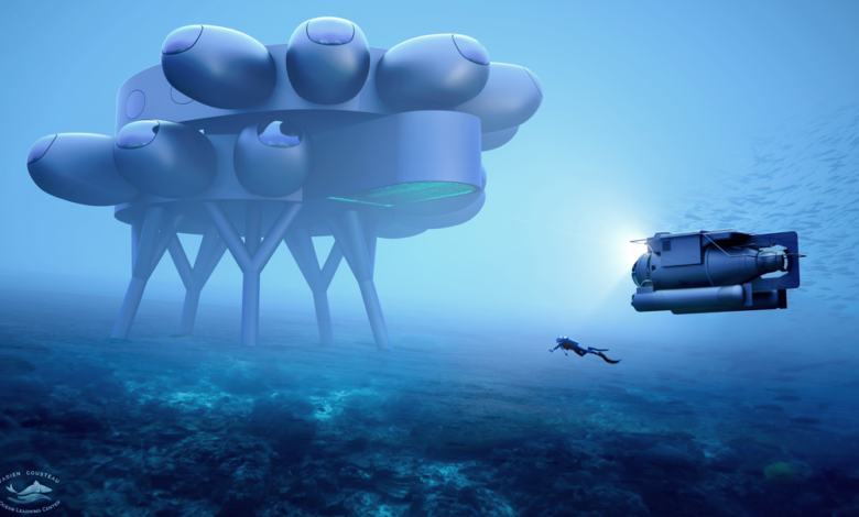 Named after the prophetic sea-god Proteus, the station will be located at a depth of 60 feet, in a biodiverse, Marine Protected Area off the coast of Curaçao. Concept designs by Yves Béhar and fuseproject. Photo Credit: fuseproject