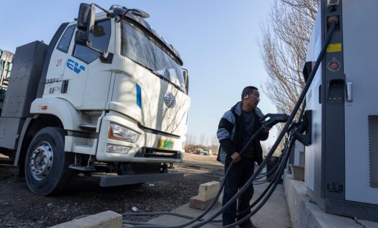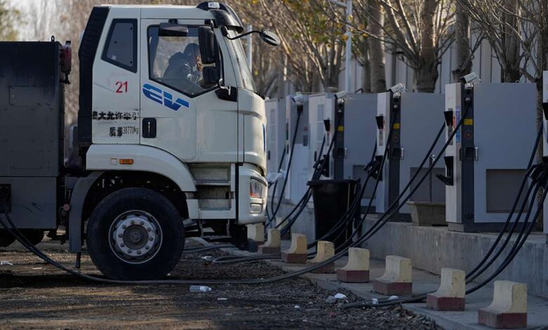 A driver charges his electric truck at a charging station on the outskirts of Beijing, on Nov. 14, 2025. Photo Credit: AP Photo/Ng Han Guan