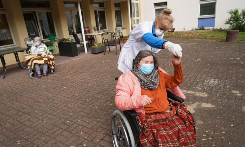 Caregiver Marine Lehmberg wears a protective face mask and gloves as she gently coaxes Marlene Schulz, 85, who has dementia, to dance to a singer's live performance at the Hermann Radtke Haus nursing home during the novel coronavirus crisis on April 29, 2020 in Berlin, Germany. Photo Credit: Sean Gallup/Getty Images