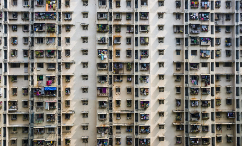 The facade of a big apartment building with the windows of many flats in Mumbai, a typical home of working class Indians. Photo Credit: Frank Bienewald