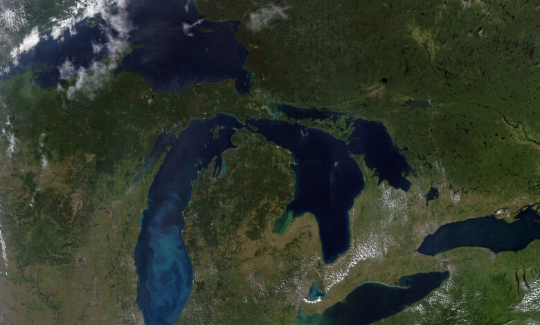 The Great Lakes dominate this true-color Moderate Resolution Imaging Spectroradiometer (MODIS) image. Lake Superior covers the upper left corner. Beneath it is Lake Michigan, and to the right is Lake Huron. Under Lake Huron is Lake Erie (left) and Lake Ontario (right). Image Credit: Stocktrek Images via Getty Images