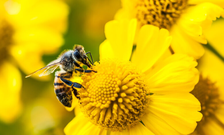 Bee gathering nectar and pollen on yellow flowers. Photo Credit: Philippe Lejeanvre/Getty Images