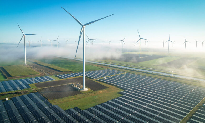Solar energy fields and wind turbines seen from the air in foggy conditions during an Autumn morning, Muntendam, The Netherlands, September 2022. Photo Credit: Daniel Bosma/Getty Images