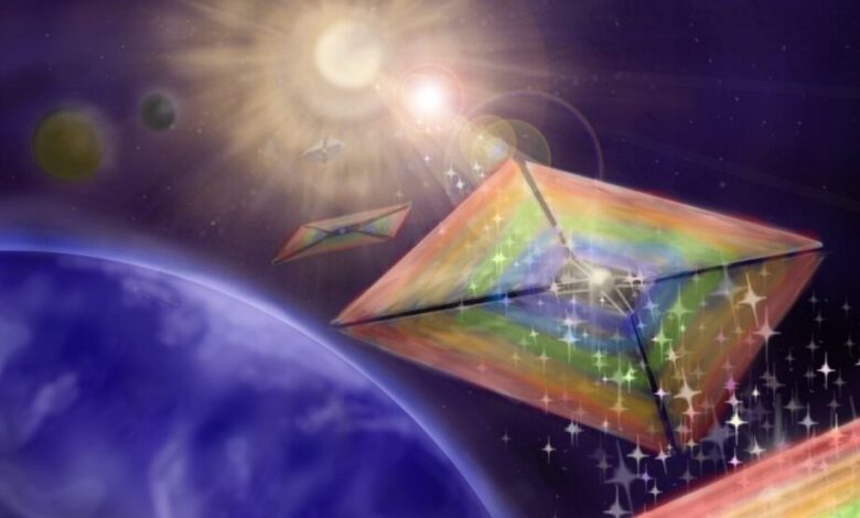 Like a regular sail uses wind to navigate across an ocean, solar sails use the pressure exerted by sunlight to move through space. Pictured: a conceptual illustration of a diffractive solar sail. Credit: MacKenzi Martin