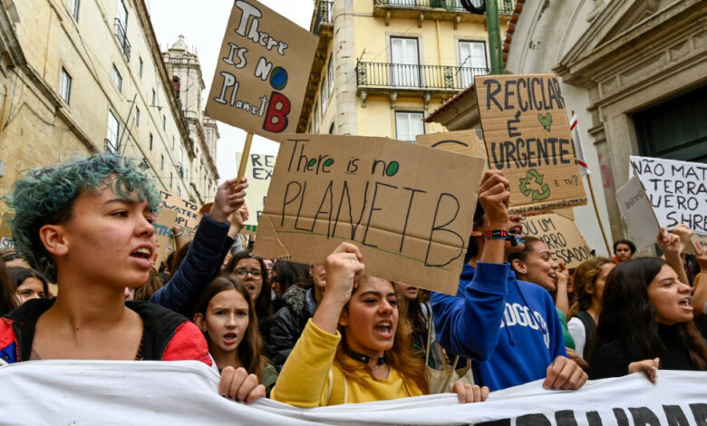 Demonstrators chant and hoist placards at a rally in support of the climate strike on November 29, 2019 in Lisbon, Portugal. Photo Credit: Horacio Villalobos/Getty Images