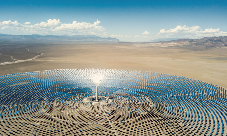 Aerial view from a drone down to large solar thermal power station in the dry desert landscape to the horizon. Nevada, USA. Photo Credit: Mlenny/Getty Images
