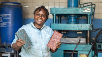 A young female entrepreneur from Nairobi, Kenya, does her part to fight the global crisis that is single-used plastic by recycling plastic objects and transforming them into textured bricks more durable than concrete ones.
