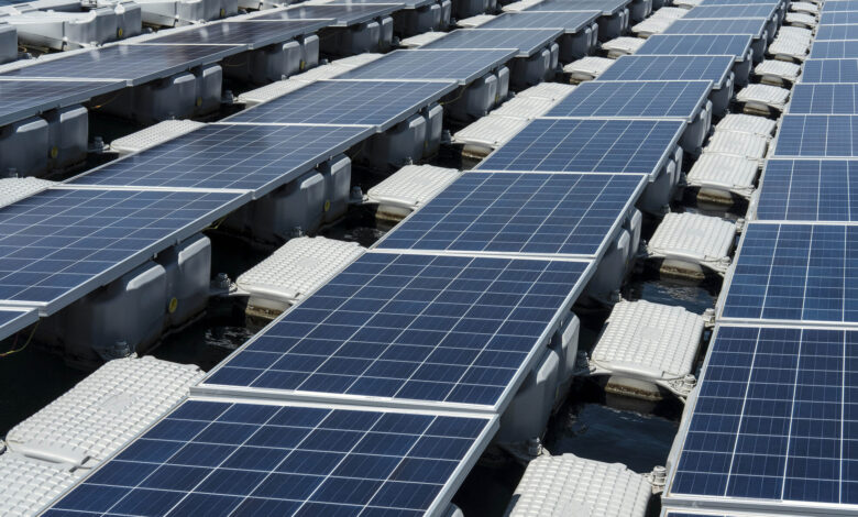 Solar panels containing photovoltaic cells float on water at a hydro electric dam project in Portugal. Photographer: Bloomberg Creative Photos/Getty Images