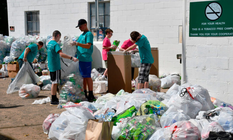 6th and 8th Grade Boys Sorting Cans and Bottles for Community Service Day, Wellsville, New York, USA. Photo Credit: Education Images via Getty Images